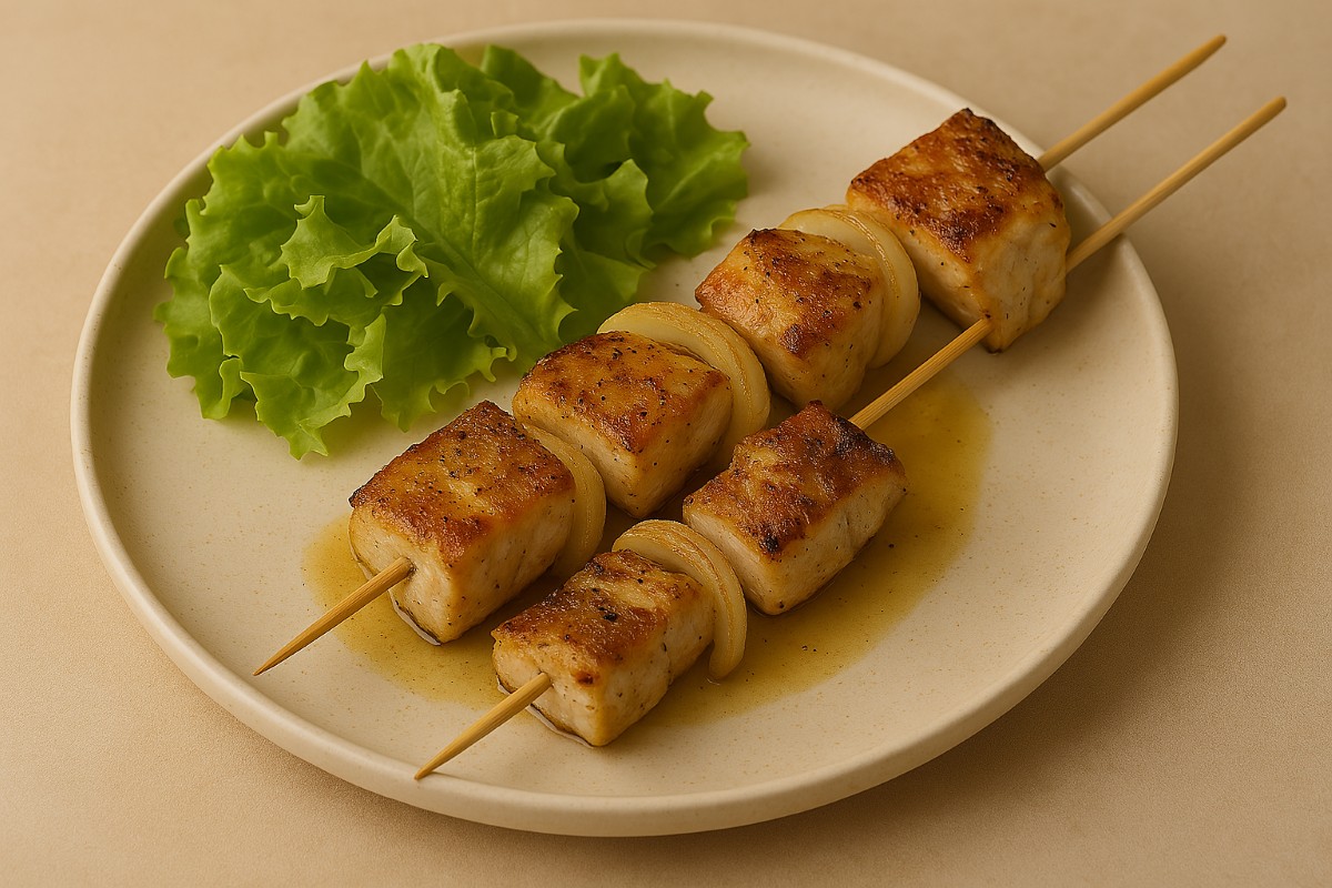 Rybu nakrájíme na kostky a pokapeme připravenou marinádou. Vše uvedené lehce promícháme a necháme v chladničce dvě hodiny proležet. Poté kousky ryby napícháme střídavě s kolečky cibule na 4 na špejle nebo kovové špízy. Potřeme po všech stranách olejem a grilujeme 5 až 6 minut. Ozdobíme kousky citrónu a můžeme podávat se zeleninovým salátem.